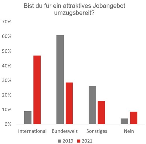 Der Anteil derer, die international umzugsbereit sind, hat sich im Vergleich von 2019 zu 2021 verdoppelt